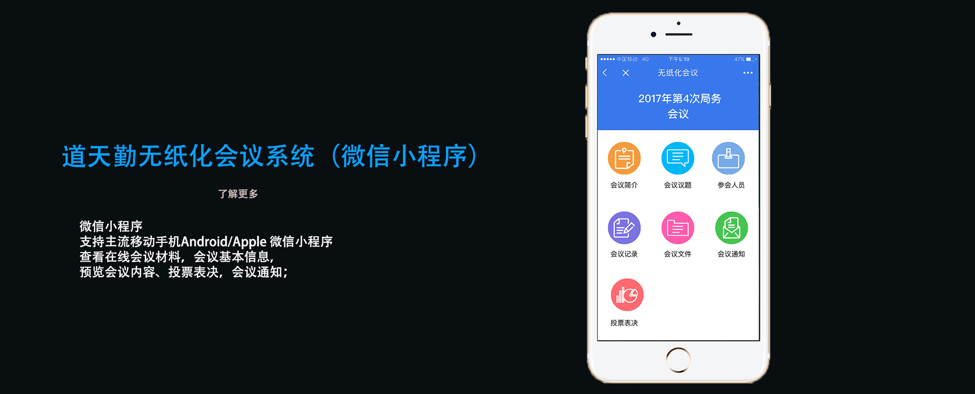 广州道天勤科技有限公司是国内首家基于自主研发无纸化会议交互系统的高新技术企业,以成熟的软件研发技术与标准化的流程方法自主开发—套具备跨平台功能的无纸化会议交互系统,领先于传统行业的创新能力和资源整合能力。技术分工明确,由需求调研组、架构设计组、美工设计组、程序开发组、软件测试组、技术服务组、研发管理部门进行设计研发流程。道天勤以标准化的产品进行研发生产,统—的业务流程进行资源管理。道天勤秉承 “道法自然“ 哲学理念,利用目前现有的创新技术,自主研发一套独特的无纸化会议交互系统。三大企业优势:1、首家基于移动互联网技术无纸化会议系统的高新技术企业2、首家研发移动平板无纸化会议软件、升降触摸终端、会议预定管理、集中控制管理功能的会议系统研发企业3、首家具备无纸化会议系统最专业的开发团队和强大的研发定制能力三大核心技术:1 、首创DTQ同屏演示利用触屏轨迹跟踪和触屏轨迹仿真技术,支持上百客户端同时并发,且理论延时<100ms 2 、首创无纸化会议系统同步备份机制以及DTQ
